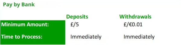 For more information on Pay by Bank, a payment method powered by Open Banking, which can offer both Instant Deposits and Instant Withdrawals to eligible customers, please click here.